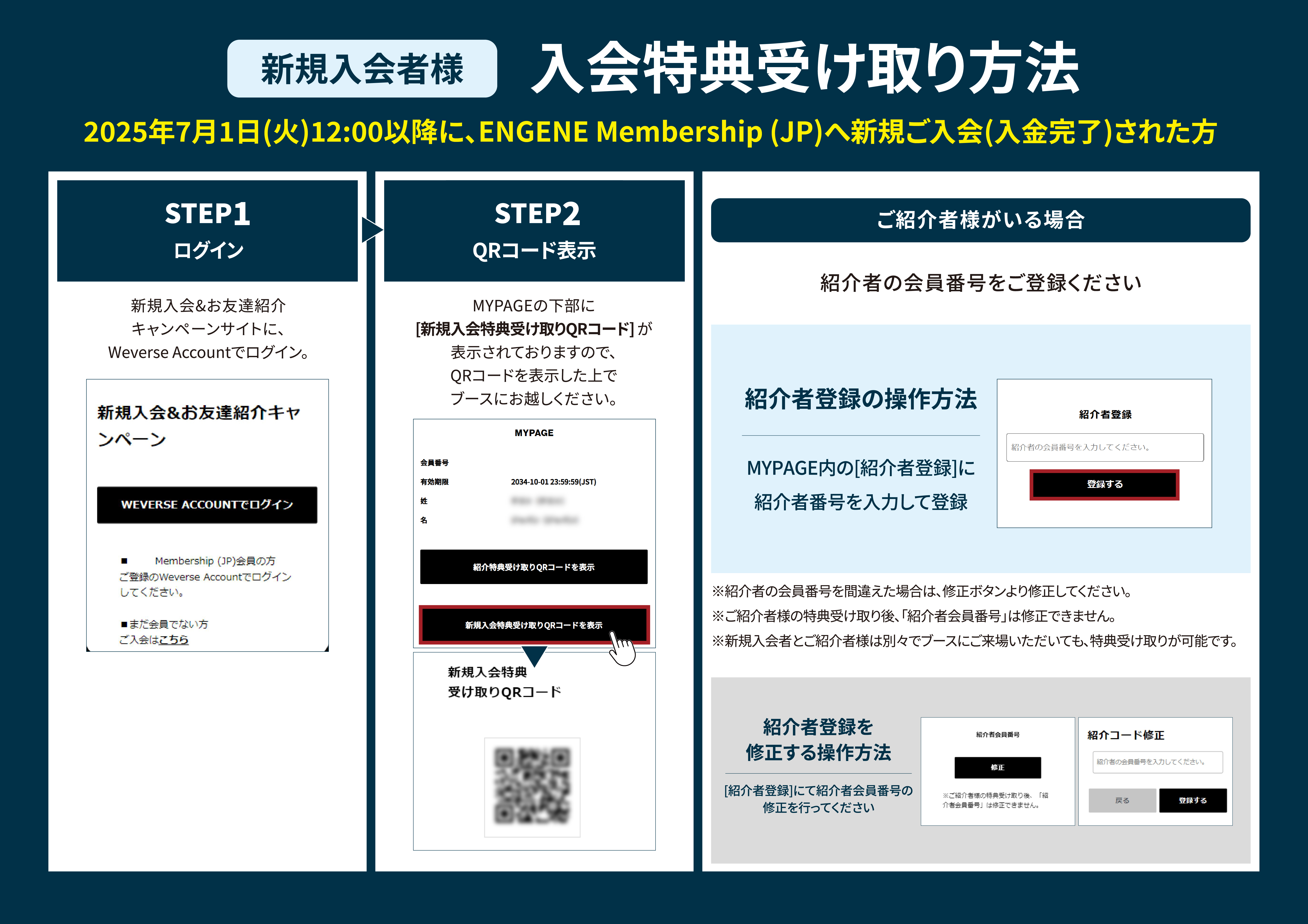 『ENHYPEN WORLD TOUR 'WALK THE LINE' IN JAPAN -SUMMER EDITION-』の各会場ENHYPEN GLOBAL OFFICIAL FANCLUB ENGENE MEMBERSHIP (JP)ブースにて実施される新規入会&お友達紹介キャンペーン参加方法の詳細についてお知らせいたします。