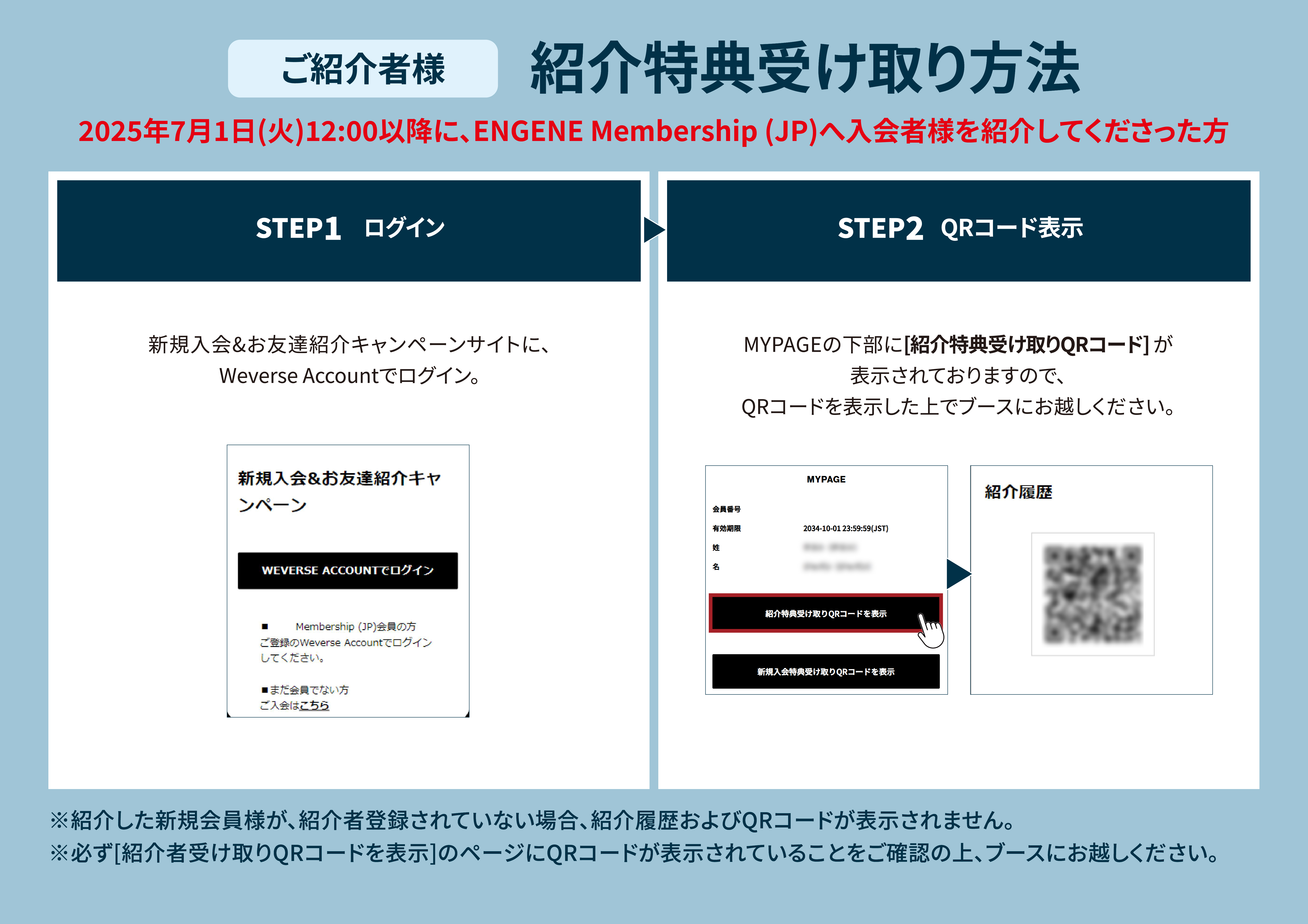 対象期間内にENHYPEN GLOBAL OFFICIAL FANCLUB ENGENE MEMBERSHIP (JP)へ入会者を紹介してくださった会員様で、特典受取当日に有効会員である方